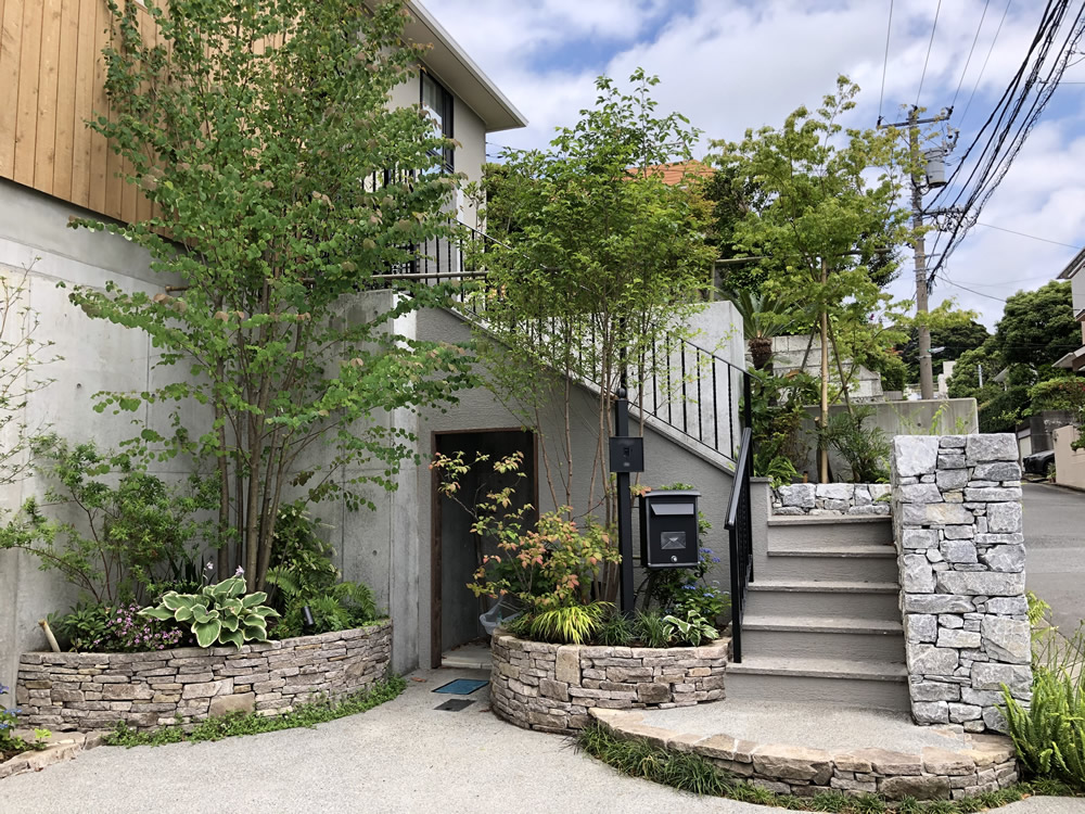 植栽・階段回り・門周りが一体化するように意識したデザインです。エントランスを大胆に斜め切りし、意匠性を持たせました。これによりヨーク・クレイジーの立上りと平面の仕上がりを際立たせています。特に目を引くデザインとなっています。素材の色味を合わせてクラウディ・ペイビングとTANZAKUを選択しました。乱形の荒々しさと、方形のスッキリ感を両立させています。