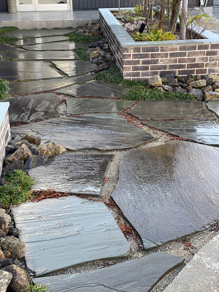 今回はミカゲ石のピンコロが大半を占めていますが、奥からつながるガーデンパスからベルジャン・スライスがピンコロの輪郭を囲い込み、バイプレイヤーですが存在感をさりげなく出しています。