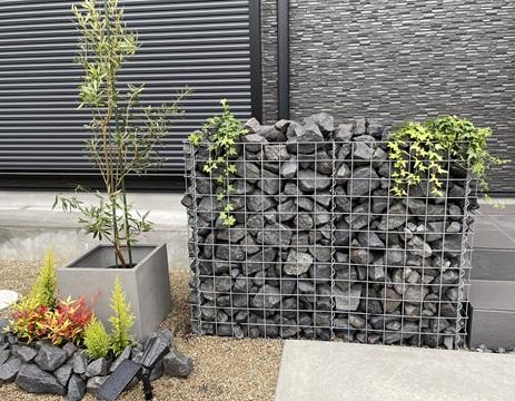 ガビオンはもともと河川の護岸工事などに使われるのが一般的でしたが、そのユニークな装飾性が注目され、ヨーロッパをはじめ多くの国で新しい生活環境プロダクトの一つとして多用されています。石塀や門柱、グリーンポットなど用途に応じて、個性的な空間 づくりに活用できます。